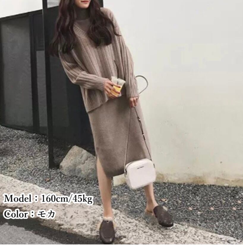 vネック 長袖 セーター ハイネック ワンピース サイド スリット 上下セット 秋冬 きれいめ カジュアル ツーピース